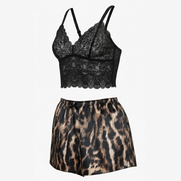 - مدل: لباس خواب زنانه با ترکیب ساتن و گیپور، طرح پلنگی