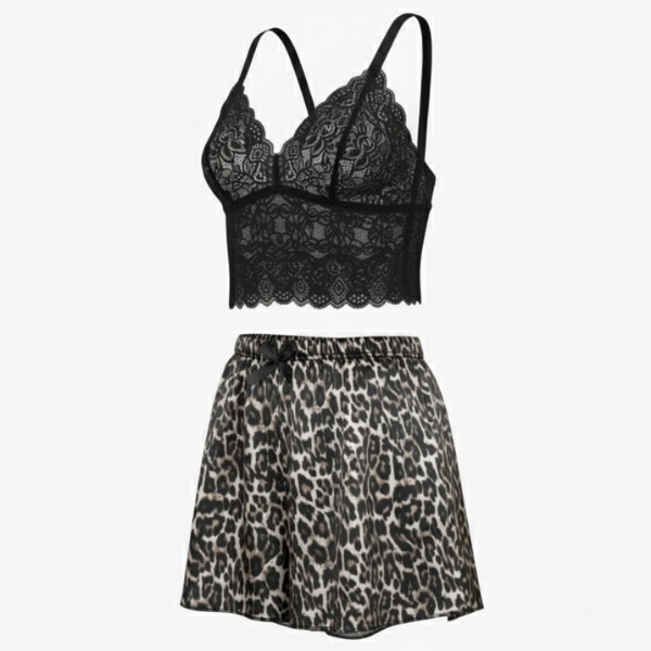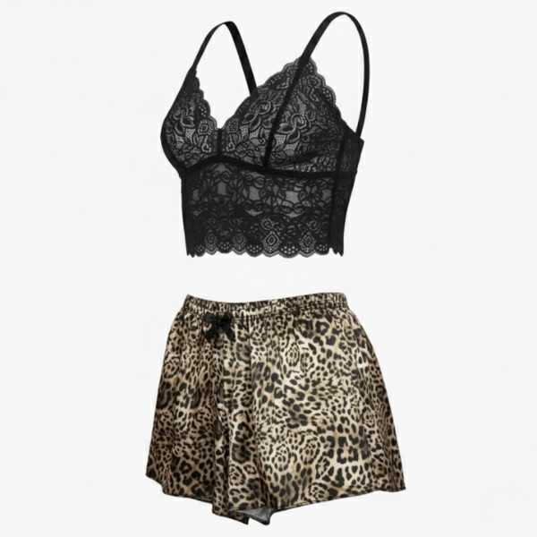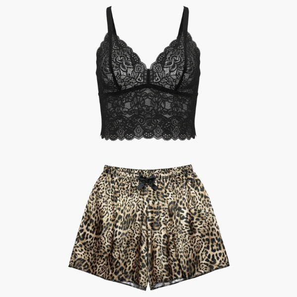 - مدل: لباس خواب زنانه با ترکیب ساتن و گیپور، طرح پلنگی